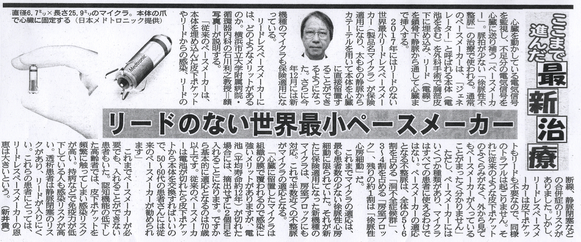 リードのない世界最小ペースメーカーを当院でも導入しており、夕刊フジに掲載されました。