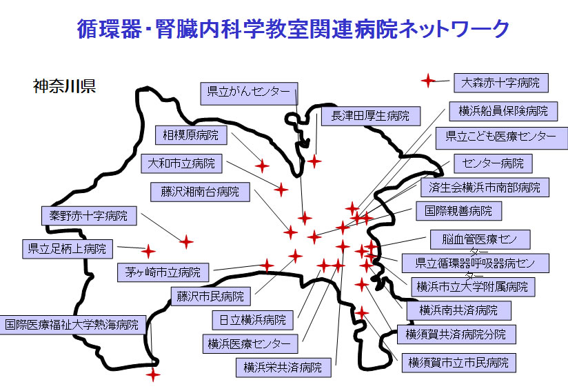 横浜市立大学循環器内科は神奈川県内の循環器医療の中核であり、関連施設のほとんどは神奈川県内の公的、準公的病院を中心とする地域医療の中核病院で構成されています。