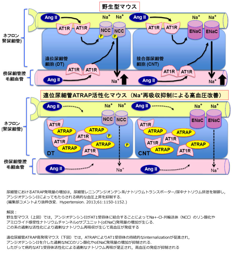 研究グループは腎尿細管におけるATRAPの機能的意義に着目し,生体において尿細管でのATRAPが生理的なAT1受容体情報伝達系活性には影響を与えずに,病的刺激下で生じるAT1受容体系の過剰活性化を抑制することで,高血圧の発症を抑制する新規システムとして機能していることを明らかにしました.