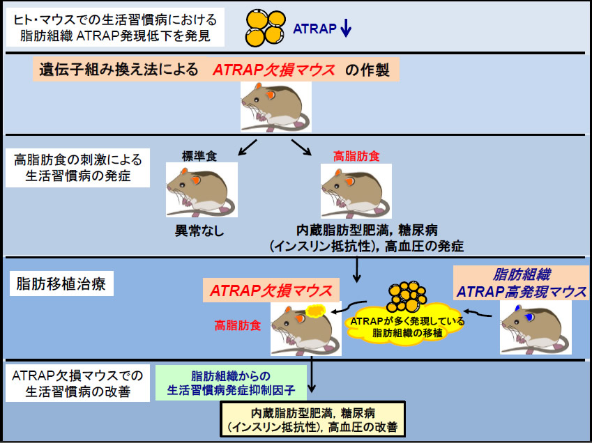実際に,今回作製されたATRAP欠損マウスでは,高脂肪食での飼育下では,内臓脂肪型肥満,高血圧,脂質異常症,インスリン抵抗性(糖尿病)などの生活習慣病が出現することがわかり,さらに,ATRAPを多く発現している脂肪組織をATRAP欠損マウスに皮下移植すると生活習慣病の症状が改善できることを証明しました(図).