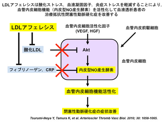 横浜市立大学附属病院先進医療推進センターとの協力のもと本附属病院腎臓高血圧内科で施行している『血液透析患者における閉塞性動脈硬化症(ASO)に対するLDLアフェレシス治療』に関する研究成果の一部が,今回, Arteriosclerosis, Thrombosis, and Vascular Biology(米国心臓病協会雑誌 AHA Journal) の5月号に掲載されました (Yuko Tsurumi-Ikeya, Kouichi Tamura, et al. Arterioscler Thromb Vasc Biol. 2010;30:1058-1065).