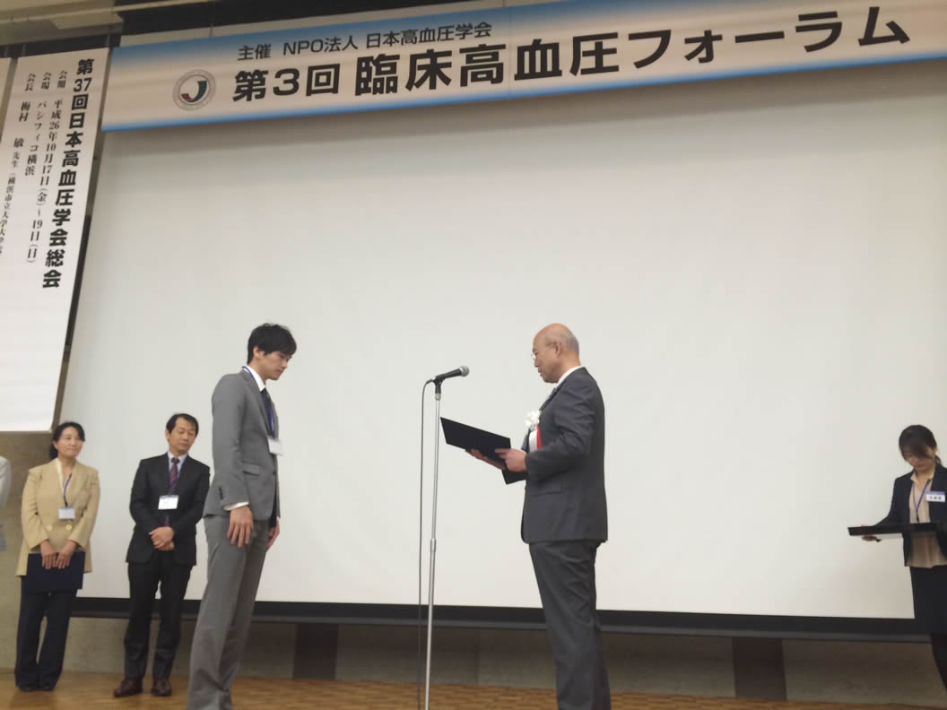 小林雄祐博士が第3回臨床高血圧フォーラム(5月24日~5月25日,広島)において,起立性低血圧に関わる動脈弾性指標CAVIと自律神経反応性に関する発表を行い,実地医療優秀賞を受賞し,表彰されました.