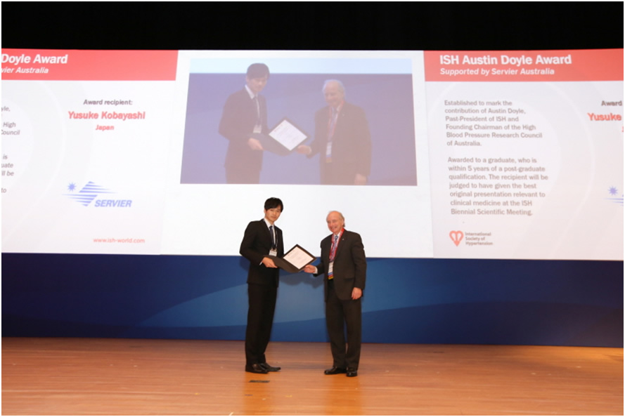 小林雄祐博士(横浜市立大学医学部客員研究員、横須賀市立市民病院腎臓内科)が平成28年9月24日~29日に行われた第26回国際高血圧学会(The 26th Scientific meeting of the International Society of Hypertension: Seoul)においてAustin Doyle Awardを受賞し、表彰されました。