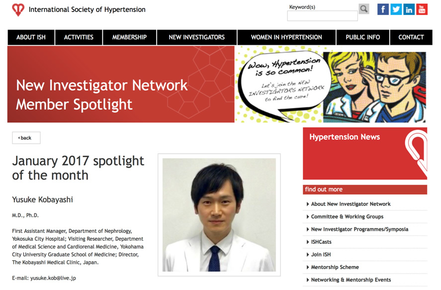 小林雄祐博士(横浜市立大学医学部 客員研究員、横須賀市立市民病院 腎臓内科)が国際高血圧学会(International Society of Hypertension)のJanuary 2017 New Investigator Spotlight of the Month(月毎に選ばれる注目する新しい研究者)に選出され、学会ホームページに写真付きインタビューが掲載されました。
