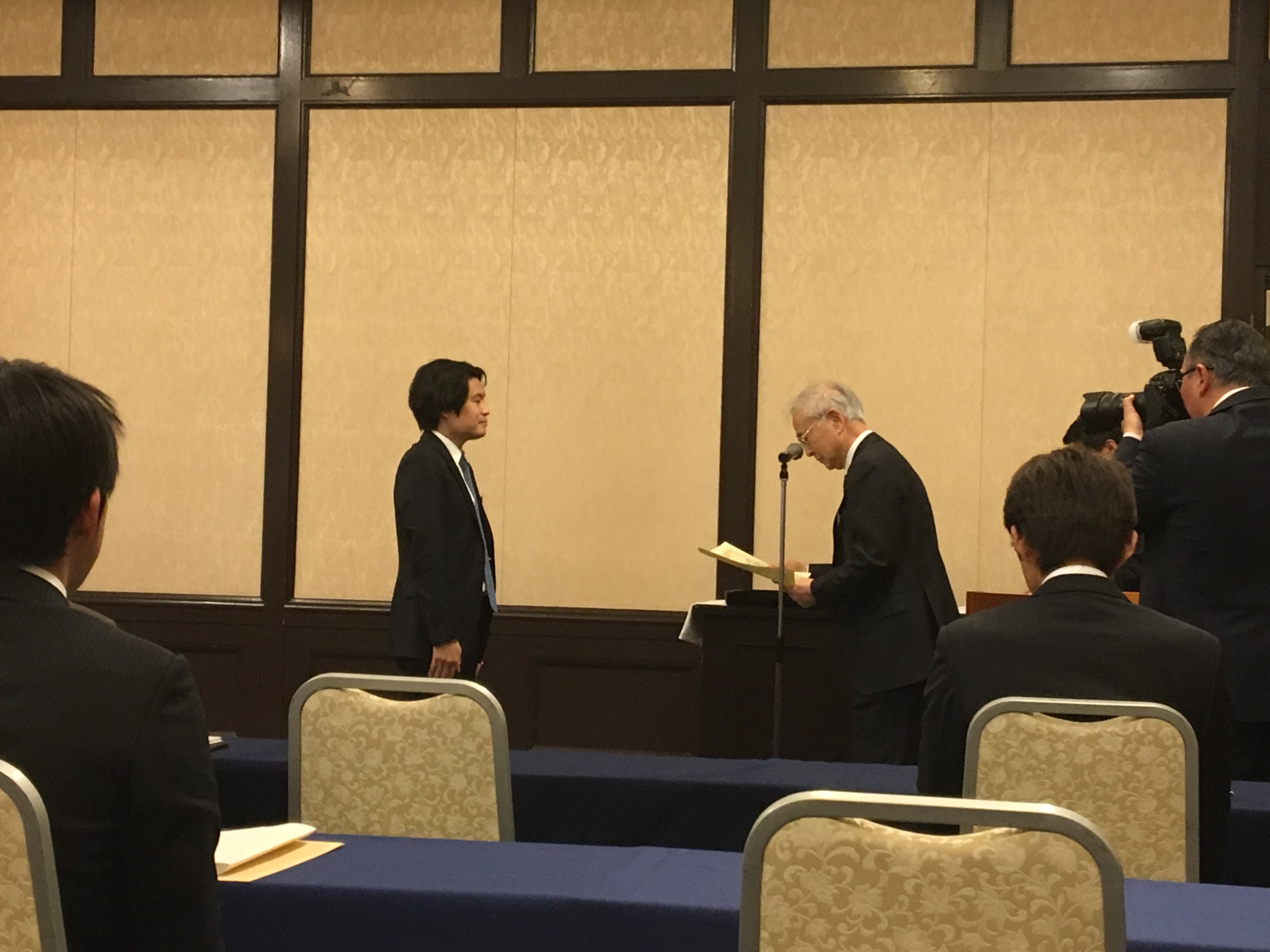 写真:受賞式で表彰される小林 竜助教(中央)と檜垣 實男会長(右端)