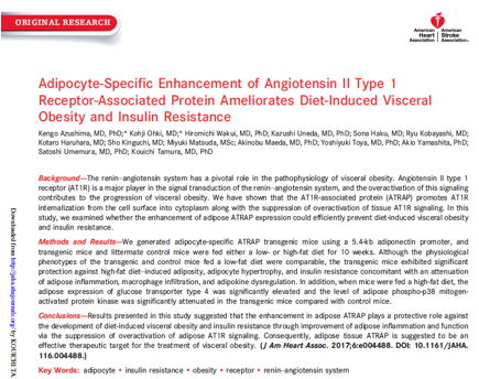 “Adipocyte-Specific Enhancement of Angiotensin II Type 1 Receptor-Associated Protein Ameliorates Diet-Induced Visceral Obesity and Insulin Resistance. J Am Heart Assoc, 2017 Mar 6;6(3). pii: e004488. doi: 10.1161/JAHA.116.004488.”