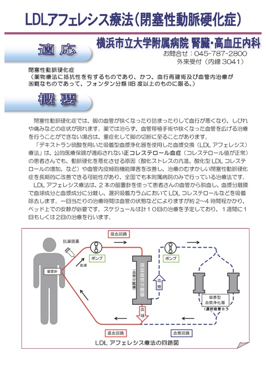 厚生労働省により2015年11月1日から認められている新規先進医療B「デキストラン硫酸を用いた吸着型血漿浄化器を使用した血漿交換(LDLアフェレシス)療法」は,公的医療保険が適応されない正コレステロール血症(コレステロール値が正常)の患者さんでも,動脈硬化を悪化させる原因(酸化ストレスの亢進,酸化型LDLコレステロールの増加,など)や血管内皮細胞機能障害を改善し,治療の困難な閉塞性動脈硬化症を長期的に改善できる可能性があり,全国でも横浜市立大学附属病院のみで行っている高度先進医療です(文献1-4).