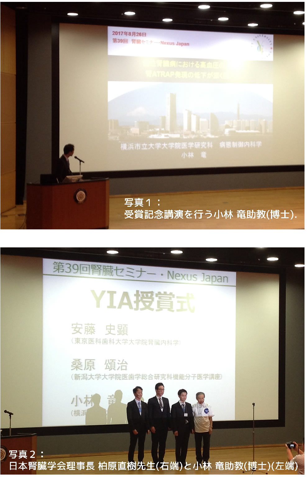 平成29年5月13日-14日に開催された第6回臨床高血圧フォーラム(岡山コンベンションセンター)にて,当教室医局員である横須賀市民病院腎臓内科 下木原久美先生,済生会横浜市南部病院腎臓高血圧内科 小林雄祐博士らの研究発表が,実地医療優秀賞を受賞し表彰されました.