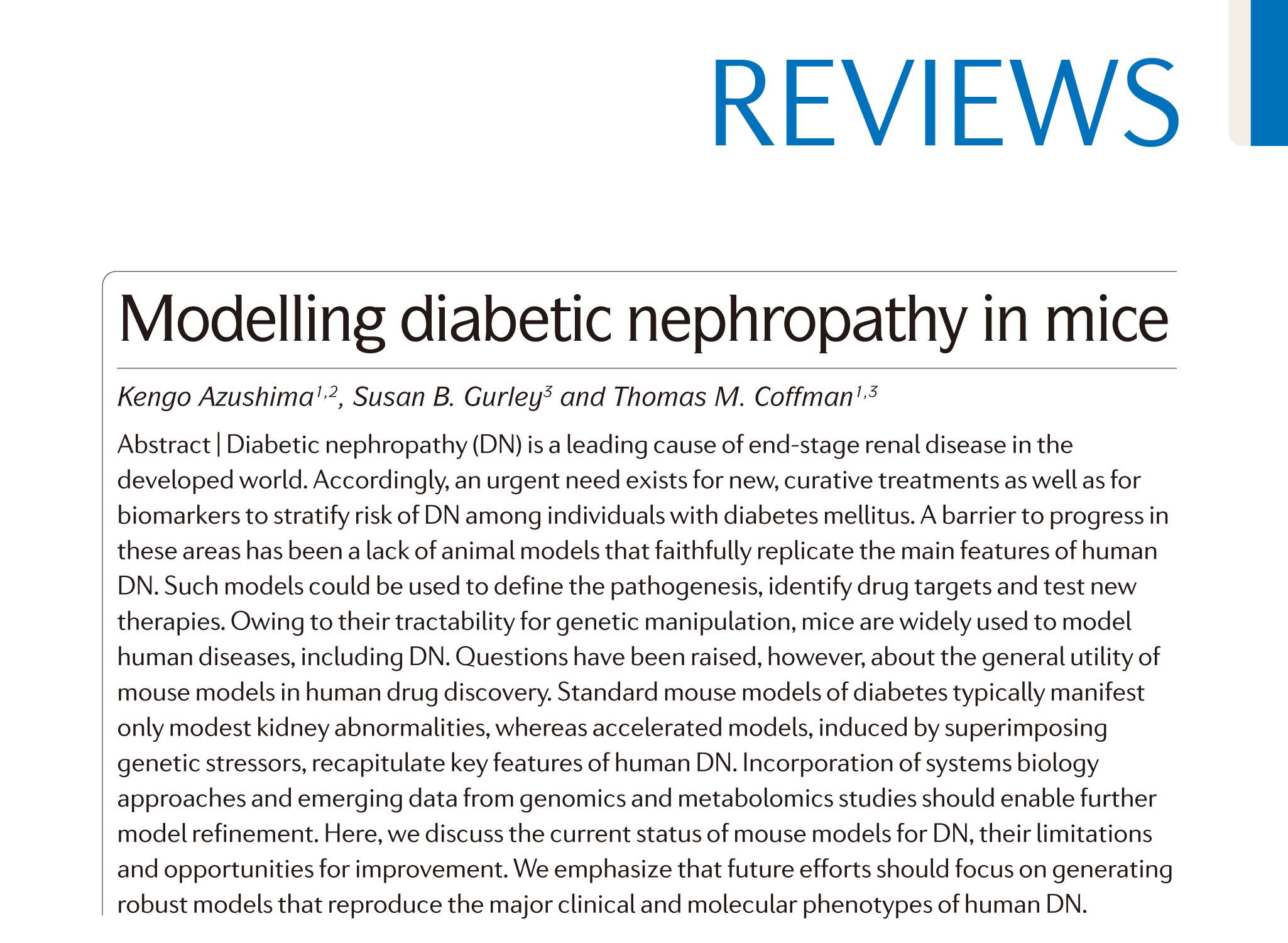 Duke-NUS Medical Schoolに留学中の小豆島健護博士(腎臓・高血圧内科,GR)が同医学部長のThomas M. Coffman教授と共同執筆した論文,「Modeling diabetic nephropathy in mice」がNature Reviews Nephrology(2017年Impact Factor:12.146)に掲載されました(2017年10月24日付オンライン掲載).