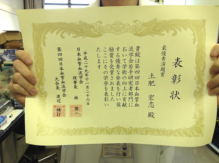 大学院3年の土肥宏志先生が、第4回日本血管血流学会(東京)で、若手研究者部門最優秀賞を受賞しました。