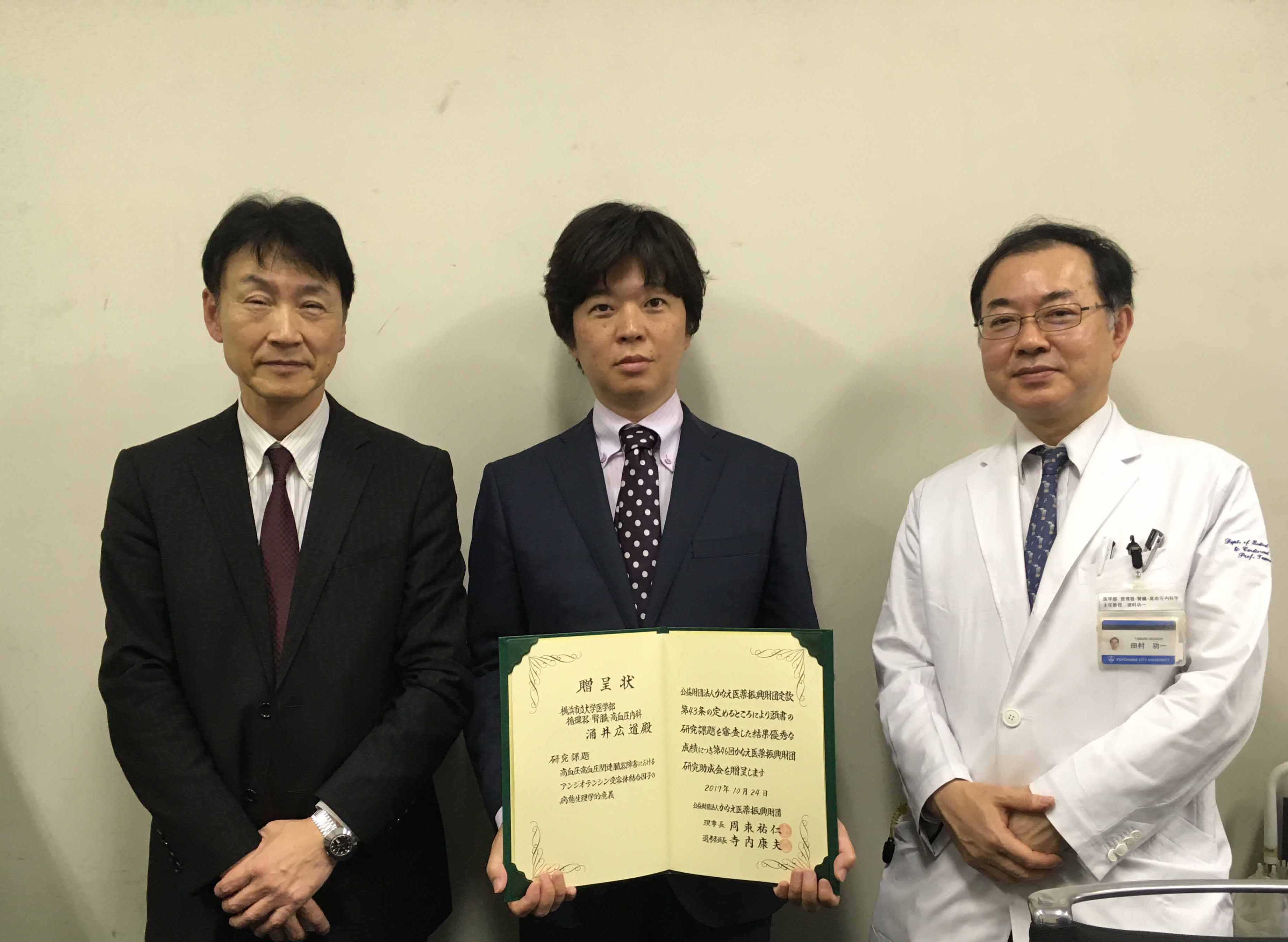 平成29年10月12日、本学附属病院10階修士講義室において、横浜医学総合財団主催の第7回梅原賞授与式がおこなわれ、循環器・腎臓・高血圧内科学講座准教授の石上友章先生に、梅原賞が授与されました。
