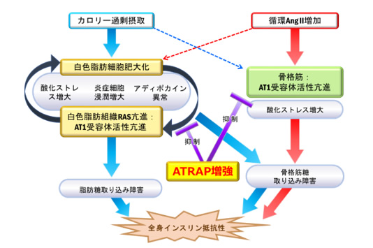 研究グループ(GR)は以前、受容体結合蛋白ATRAPを内臓脂肪組織で活性化させると、高カロリー摂取でおきる脂肪細胞の肥大化・炎症およびアンジオテンシン受容体の過剰な亢進状態が是正され、内臓脂肪型肥満とインスリン抵抗性が改善することを報告しました。
