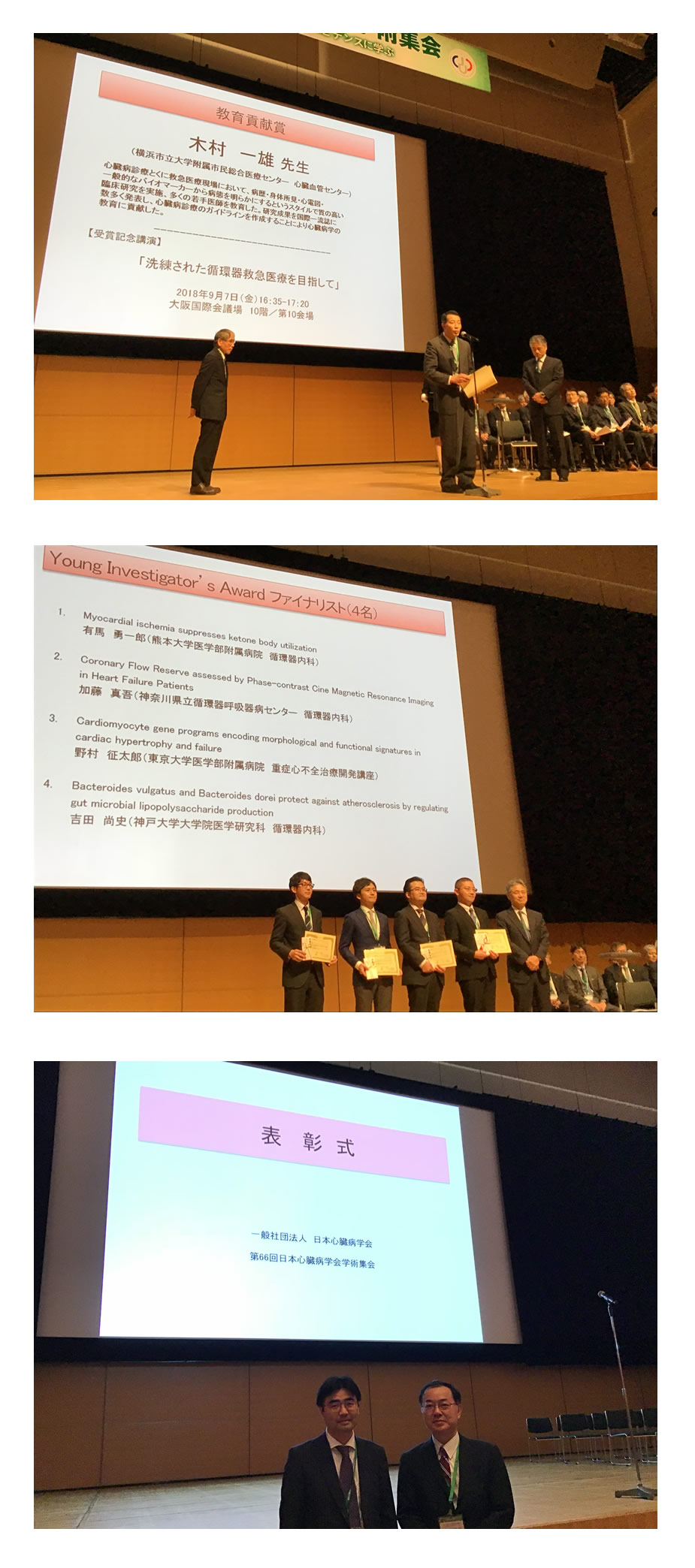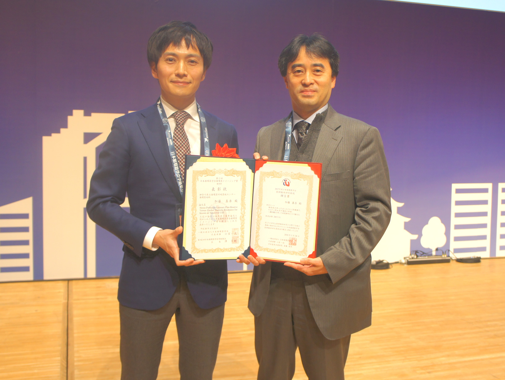 2018年3月23日-25日 大阪で第82回日本循環器学会総会が開催され,神奈川県立循環器呼吸器病センター循環器内科の加藤真吾博士が「日本循環器学会循環器イメージング賞 優秀賞」ならびに「日本循環器学会医師臨床研究助成」に選出され、大会2日目の授賞式において表彰されました(写真).