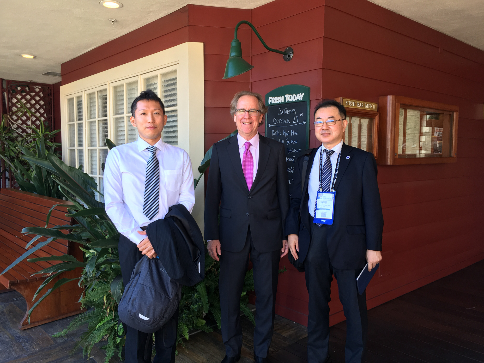 写真:表彰セレモニーにて 国際腎臓学会理事長David Harris先生(中央)と畝田助教(左)、小豆島博士(右)