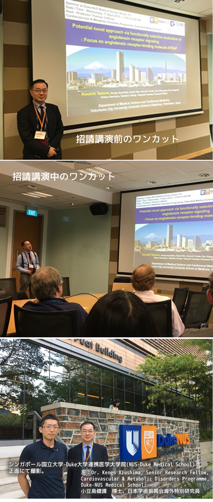 田村功一主任教授が、Duke大学-シンガポール国立大学連携医学大学院(Duke-NUS Medical School) 医学部長(Dean)のThomas M. Coffman教授の招聘を受け、日本学術振興会科学研究費(基盤研究B、基盤研究C、若手研究、研究活動スタート支援)、AMED革新的医療技術創出拠点プロジェクト/橋渡し研究戦略的推進プログラム、AMED循環器疾患・糖尿病等生活習慣病対策実用化研究事業/腎疾患実用化研究事業、AMED難治性疾患実用化研究事業、ソルト・サイエンス研究財団医学プロジェクト研究助成、上原記念生命科学財団研究助成・研究奨励助成、かなえ医薬振興財団研究助成、先進医薬研究振興財団循環医学分野研究助成、万有生命科学振興国際交流財団Banyu Foundation Research Grant、横浜総合医学振興財団推進研究助成、横浜市立大学かもめプロジェクト、等の助成による研究成果についての招請講演を行いました(会告)。