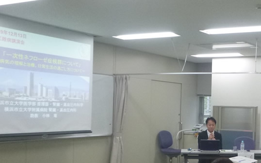 2019年12月13日、横浜市立大学医学部 循環器・腎臓・高血圧内科学の小林 竜助教が指定難病「一次性ネフローゼ症候群」について患者様・患者様ご家族を対象に泉区役所にて難病講演会を行いました。