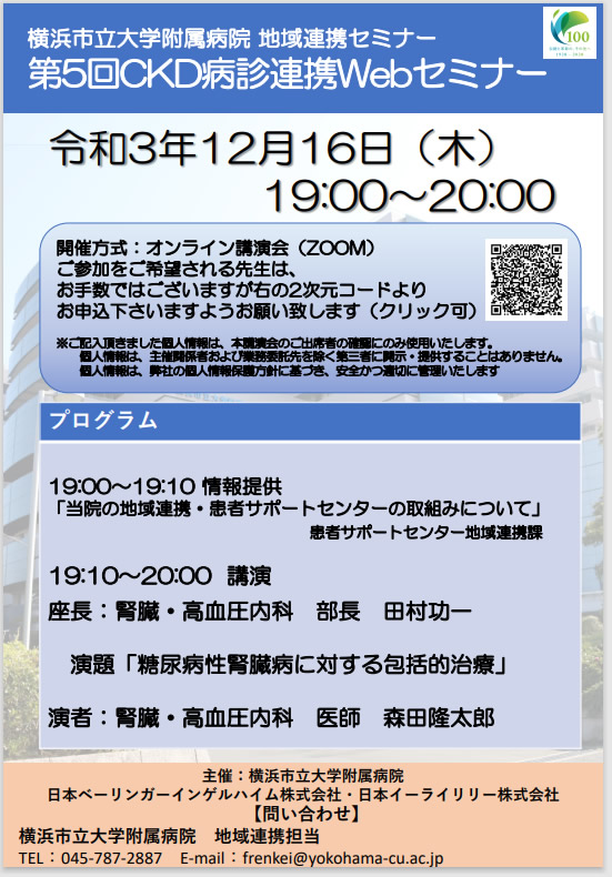 2021年12月16日 木曜日 横浜市立大学附属病院第5回CKD病診連携WEBセミナー(フォーカス:糖尿病性腎臓病の包括的治療 開催のお知らせ