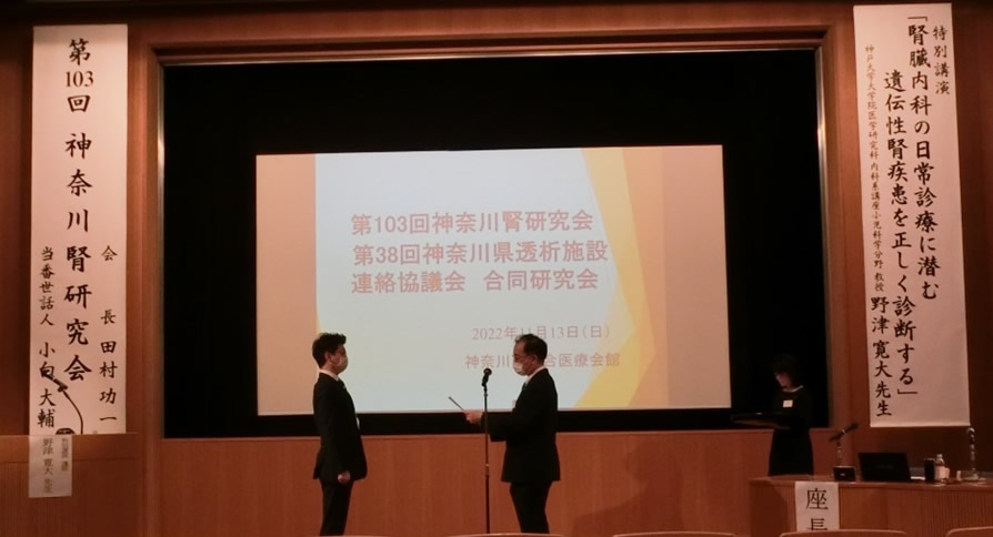 第103回神奈川腎研究会(当番世話人 川崎幸病院 小向大輔先生; 第8代会長 田村功一)が2022年11月13日(日)に開催され、大学院生の金井大輔先生が優秀演題賞を授賞しました。