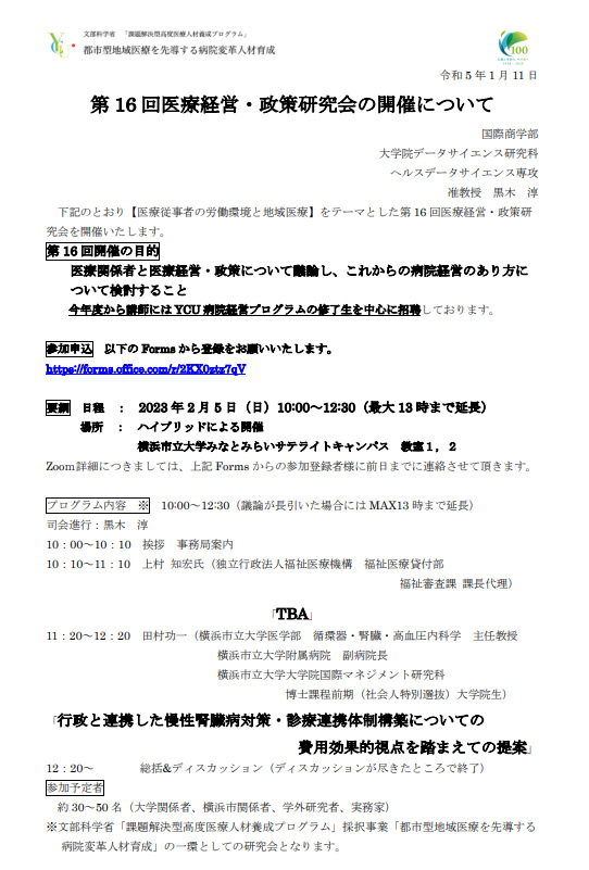 横浜市立大学第16回医療経営研究会(2023年2月5日(日)午前ハイブリッド開催)』において、田村功一主任教授が医療政策関連の講演を行います