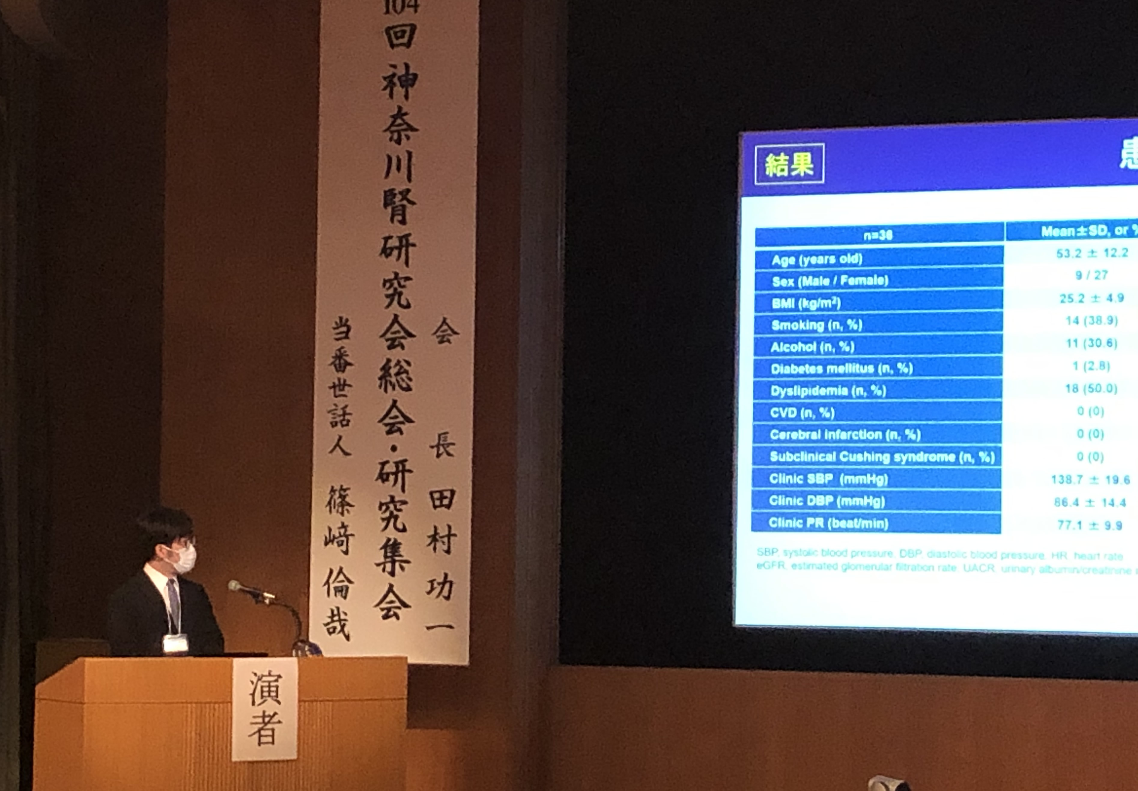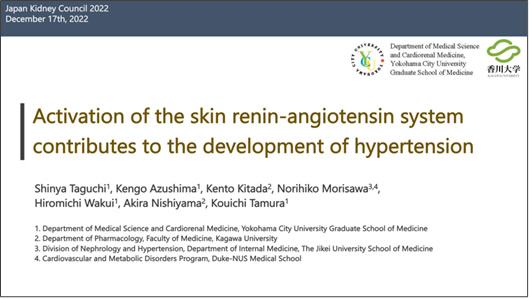 本学術大会では、田村 功一 主任教授が大会長を、小豆島 健護 助教が事務局長を務め、循環器・腎臓・高血圧内科学教室(腎臓・高血圧G)からは、YIA審査口演1演題、一般口演3演題、スポンサードシンポジウム1演題の発表・講演があり、会場では活発な議論が行われとても盛況でした。
