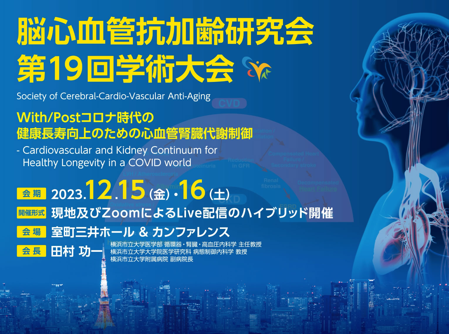 来たる2023年12月15日(金)・16日(土)に脳心血管抗加齢研究会第19回学術大会を現地(東京都中央区日本橋 室町三井ホール & カンファレンス)とWEB(ZoomによるLive配信)のハイブリッド開催形式にて開催させていただきます(同時開催:日本抗加齢協会第7回学術フォーラム)。